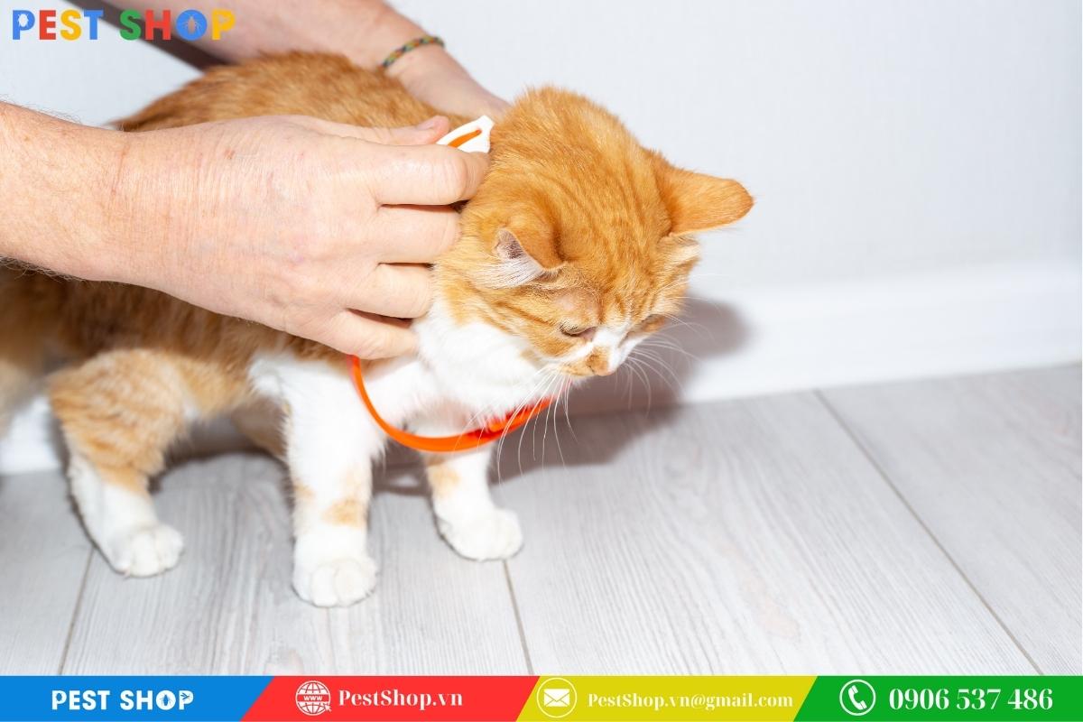 - Bước 3: Đeo vòng che đậy, tránh để mèo liếm láp vùng da vừa nhỏ thuốc.