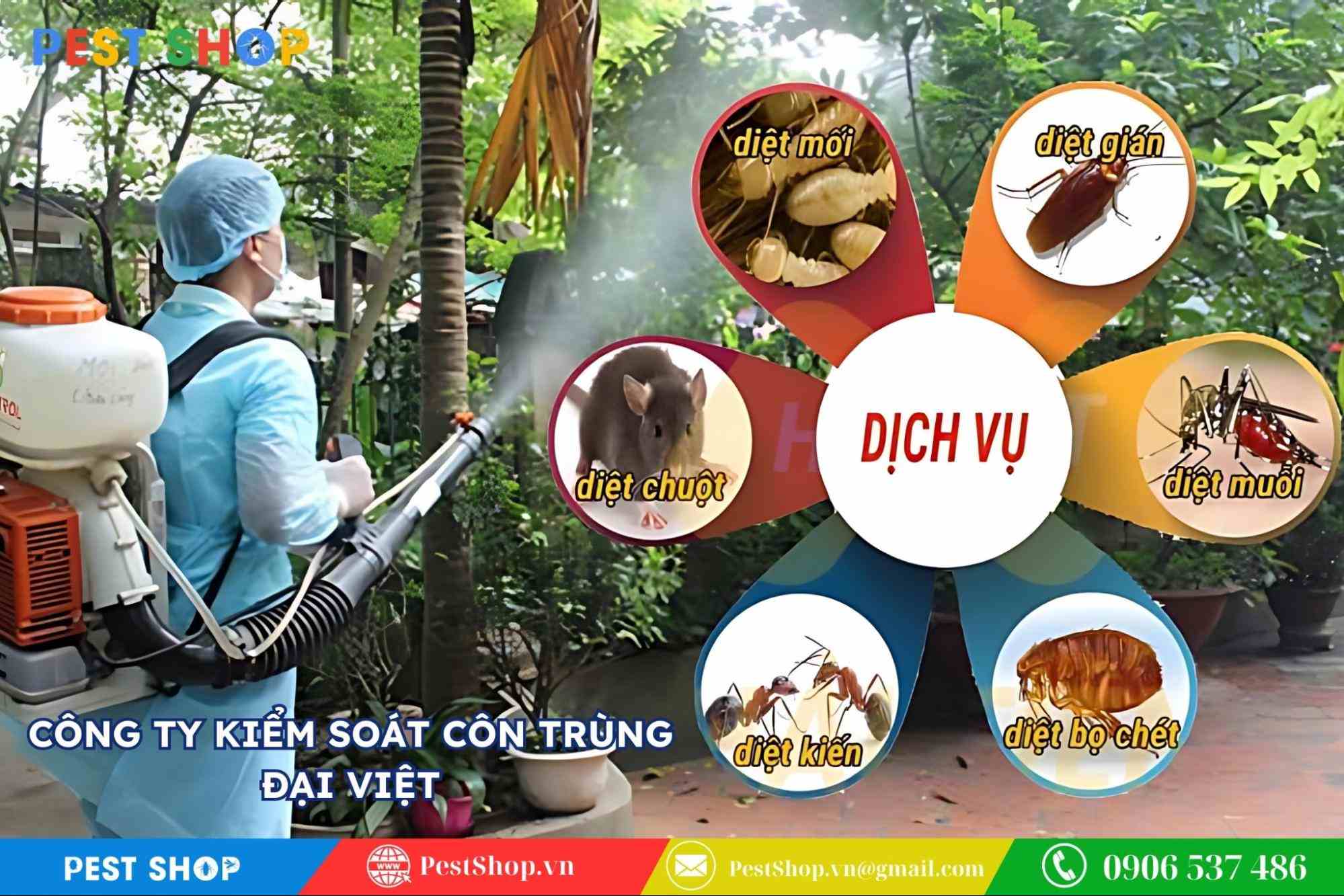 Dịch vụ cung cấp: Dịch vụ diệt mối, chuột, muỗi, ruồi, kiến, gián, bọ chét, mọt.