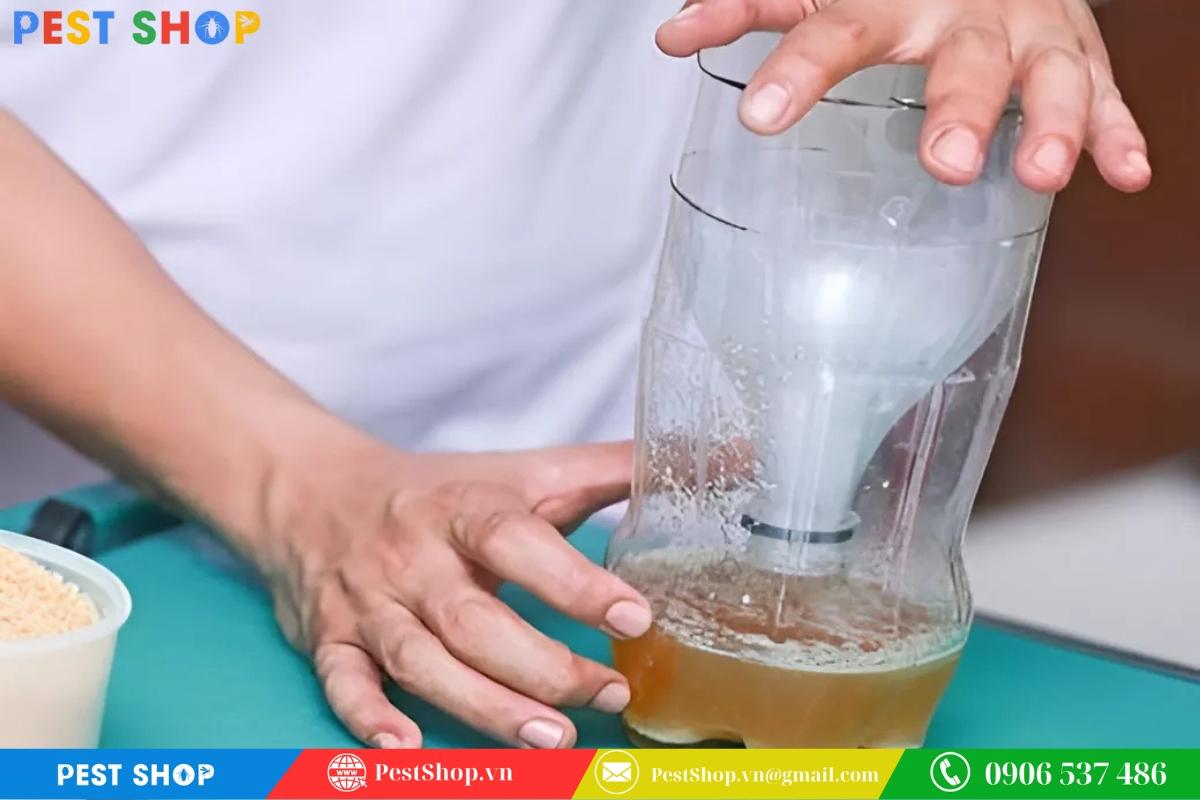 - Bước 3: Đặt bẫy ở nơi có nhiều muỗi hoạt động như cạnh cửa sổ, trong góc phòng,… Muỗi bị thu hút bởi mùi hương và bay vào chai và mắc lại trong phễu, không thể thoát ra ngoài.