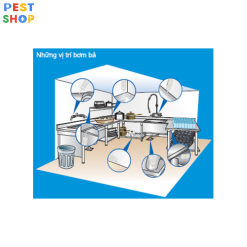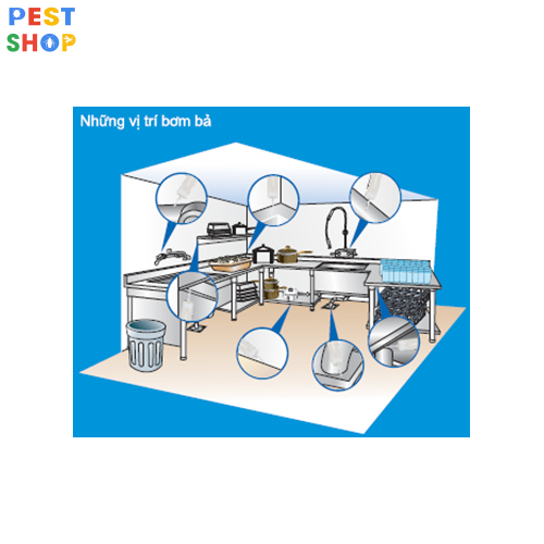 - Sử dụng 1 gam mồi cho mỗi điểm. Một lượng to như hạt đậu đỏ. Cố định sát chân tường, dưới chân tủ hoặc bên trong kệ chỗ góc cạnh, bản lề.