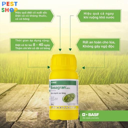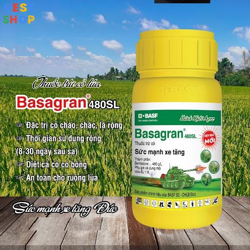 Basagran 480SL là thuốc trừ cỏ hậu nảy mầm, thuộc thế hệ mới nhất, có xuất xứ từ Châu Âu. Thuốc có tác dụng diệt cả cỏ có khả năng kháng thuốc như cỏ cháo chác.