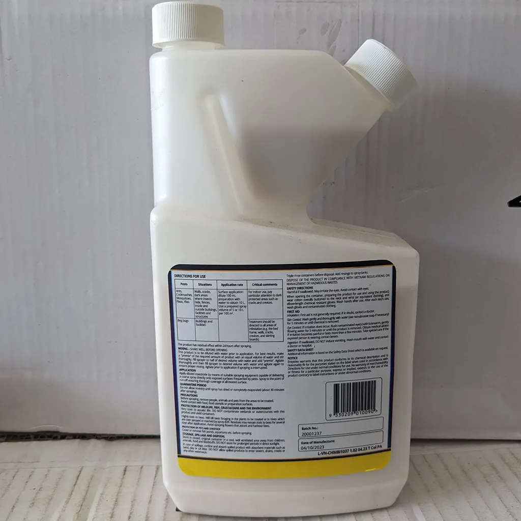 Tường vách, khe nứt, khu vực tối nơi côn trùng trú ẩn, hàng rào trong và ngoài nhà, các cơ sở và kết cấu | Pha loãng: 10ml / Lít nước Phun: 1 lít / 20m2 |