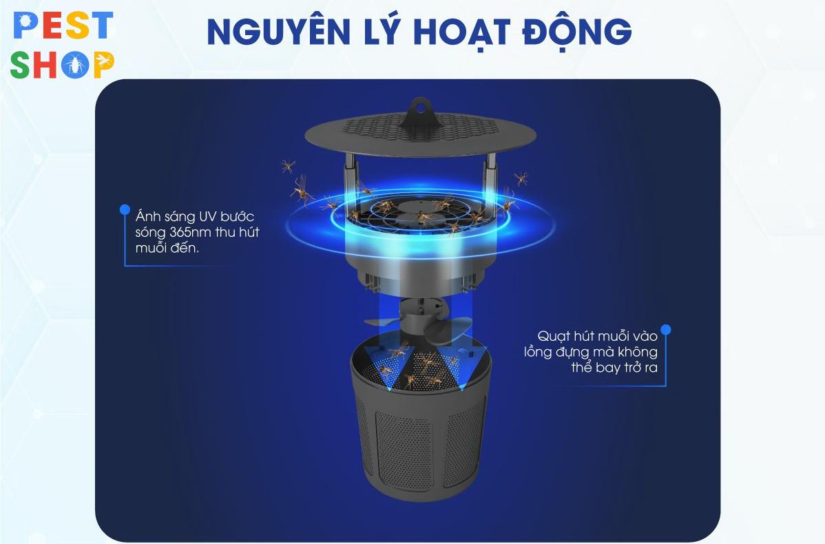 - Côn trùng sẽ bị quạt hút vào lồng chứa bên dưới và cánh quạt sẽ quạt mạnh khiến chúng không thể bay ra ngược ra ngoài.