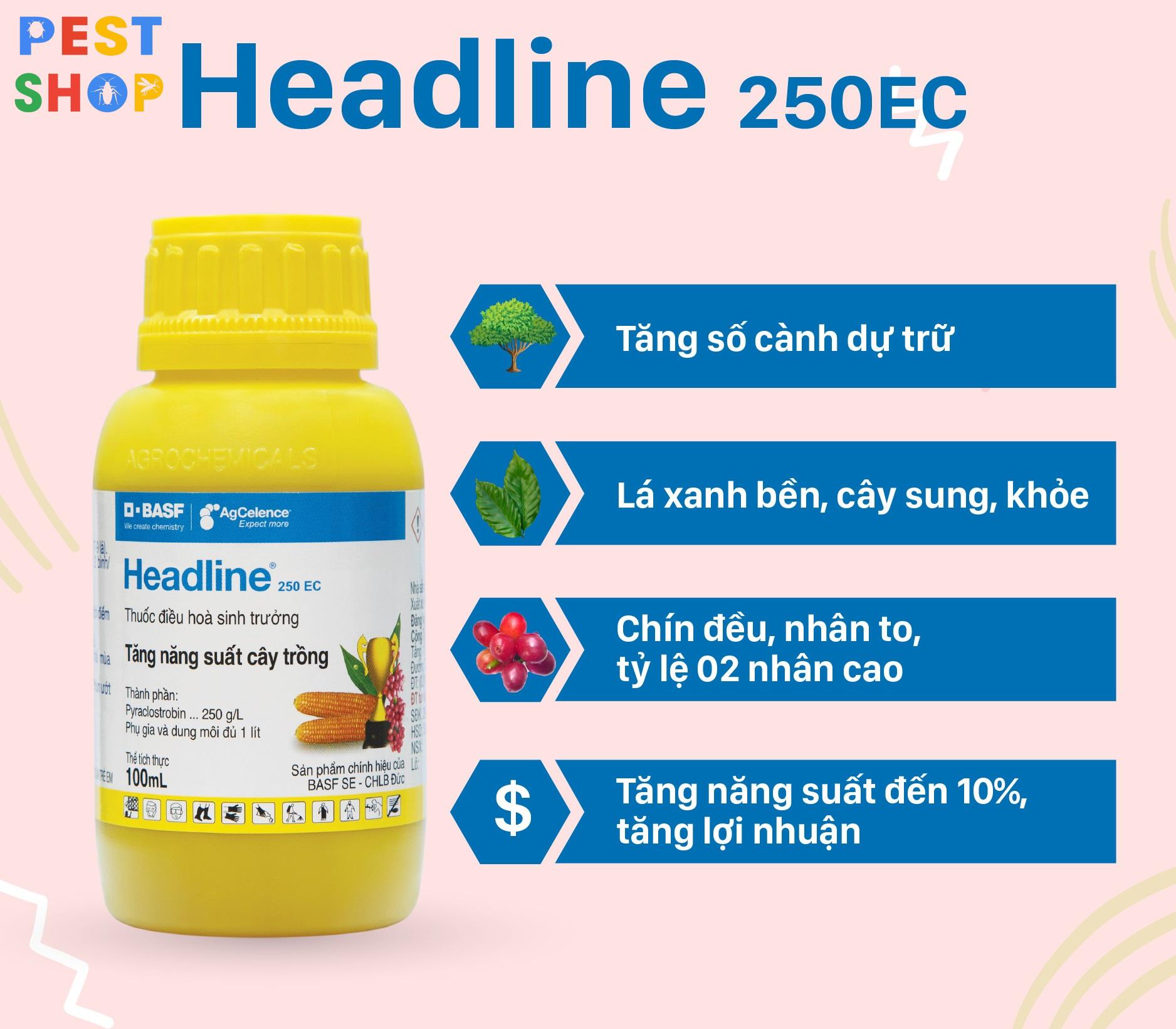Headline 250EC Thuốc có tác dụng tăng cường khả năng thu đạm, giảm quá trình tiêu hao năng lượng, qua đó giúp lá xanh, cây khỏe, cành phát, trái to, bóng, đều, đẹp và tăng năng suất vượt trội. Chế phẩm là thuốc điều hòa sinh trưởng thế hệ mới của BASF- CHLB Đức.