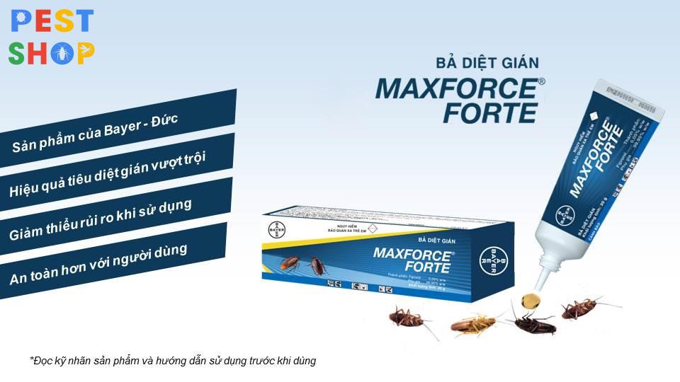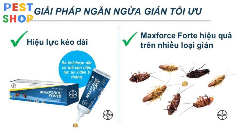 - .Thuốc diệt gián Maxforce Forte có công thức đặc biệt đã được chứng minh có khả năng hấp dẫn vị giác của rất nhiều loài gián. Nghiên cứu cho thấy thuốc diệt gián Maxforce Forte vẫn giữ nguyên hương vị trong hơn hai tuần sau khi đặt bả, lâu hơn gấp 2 lần so với các sản phẩm khác.