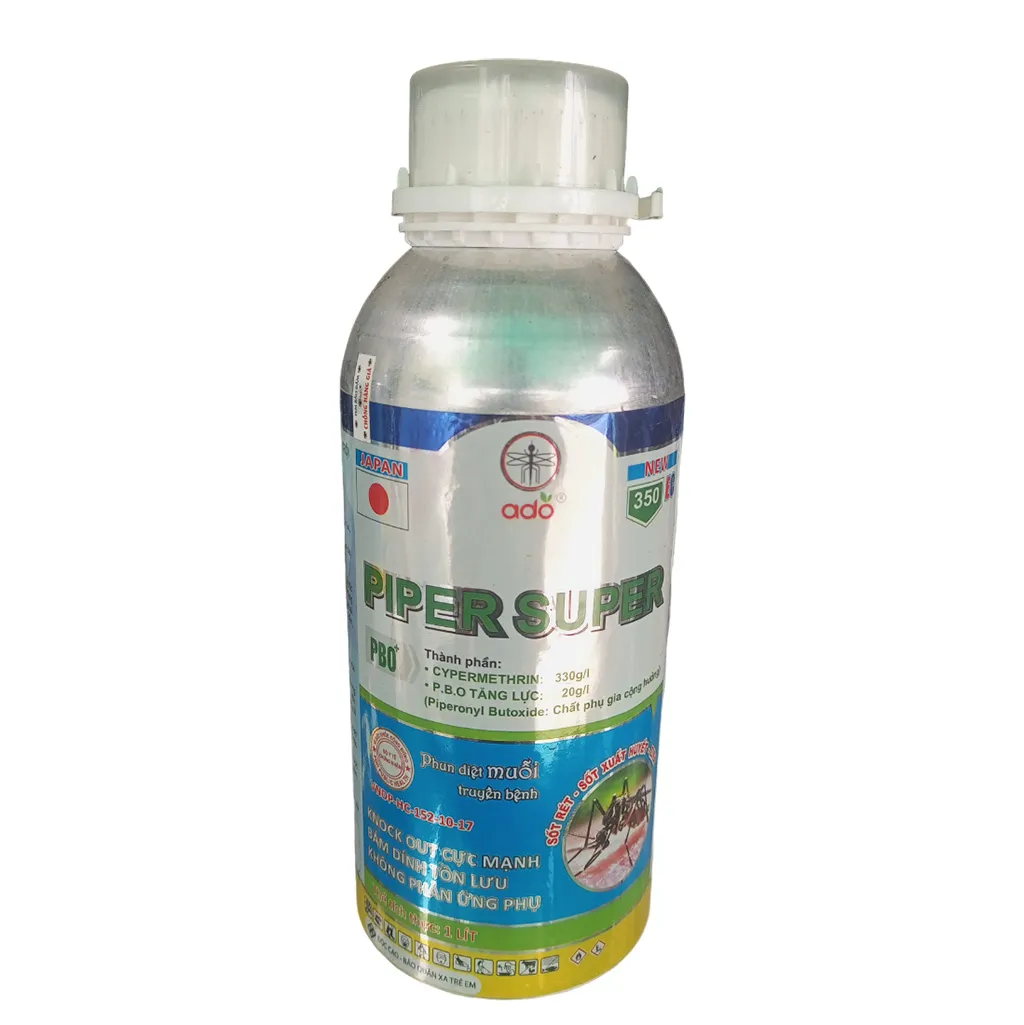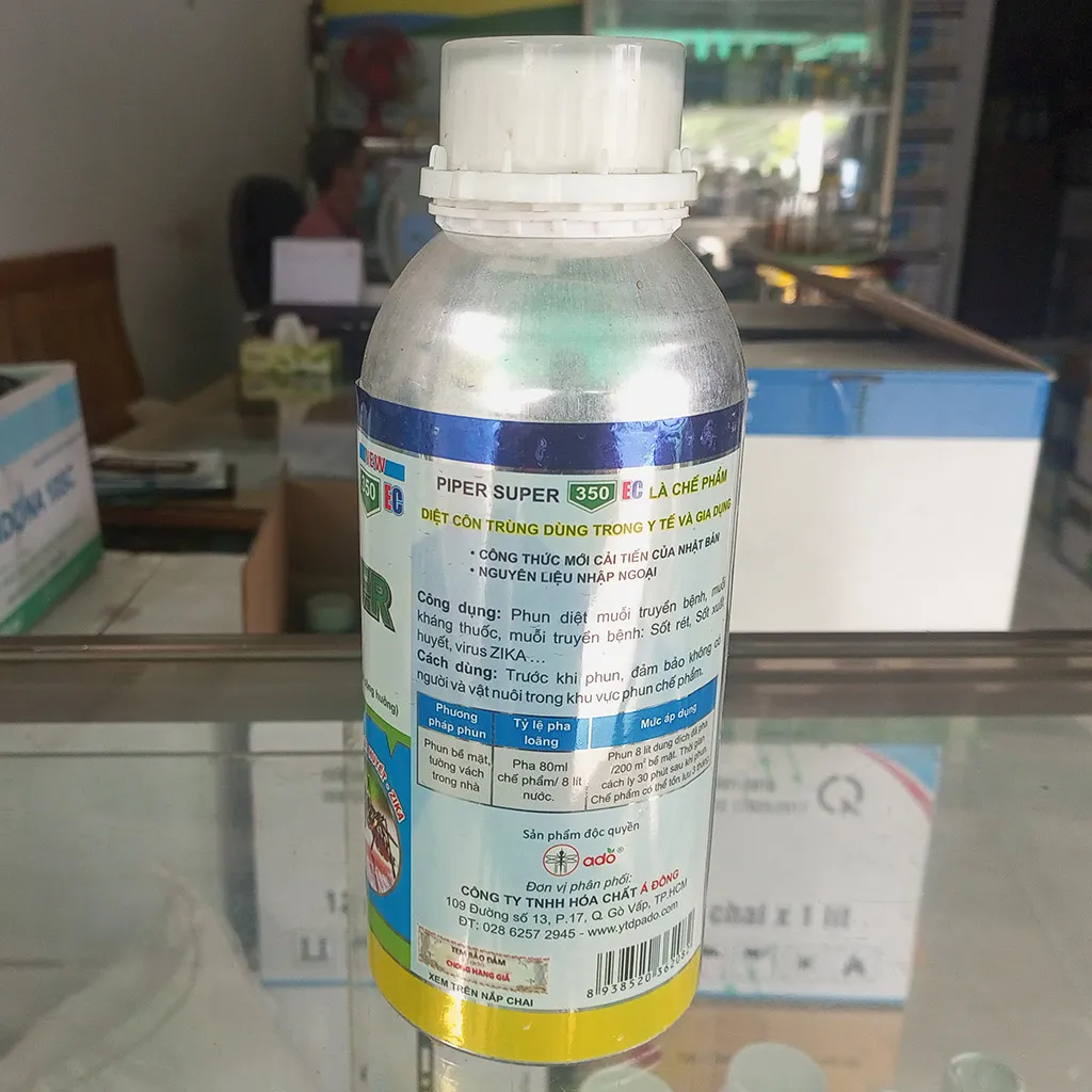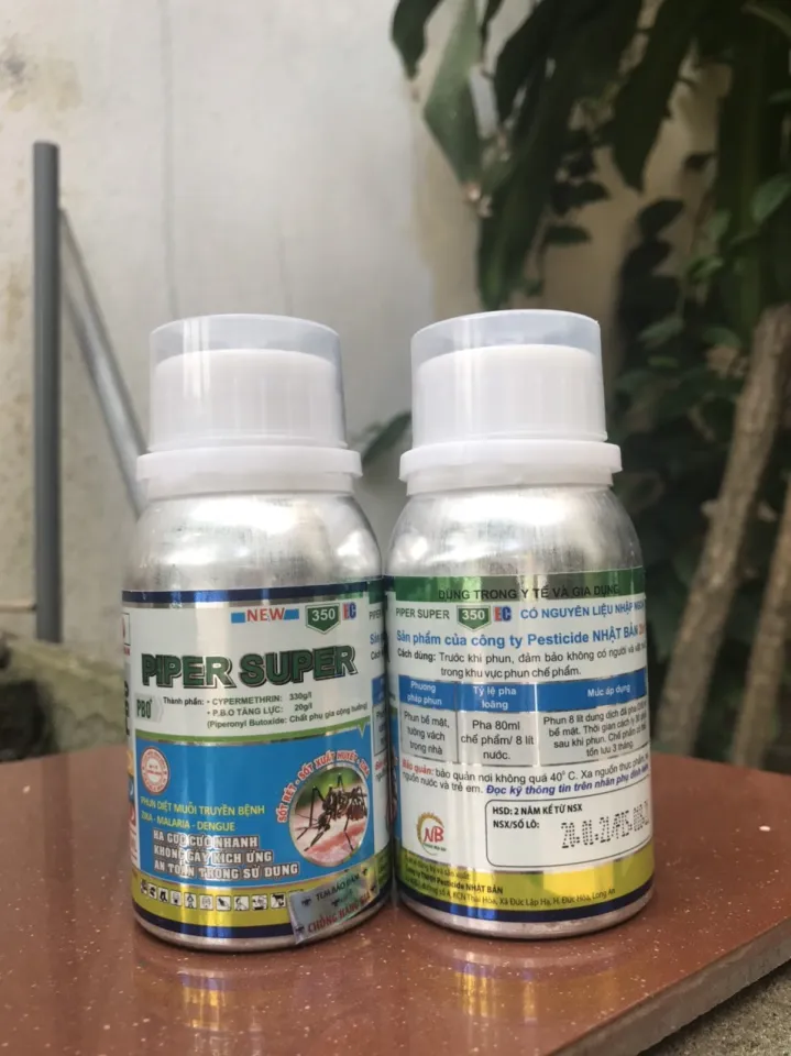 Piper Super 350EC là chế phẩm thuốc diệt muỗi sinh học có công dụng diệt trừ các loài côn trùng gây hại trong gia đình. Giúp tiêu diệt các loài muỗi gây bệnh truyền nhiễm như: muỗi vằn, muỗi cỏ,… Piper Super 350EC Do Việt Nam sản suất. Chế phẩm diệt côn trùng Piper Super 350EC có thời gian tồn lưu dài trên bề mặt như gạch, gỗ, sàn bê tông, xi măng,… và đặc biệt không bị hoen ố các vật dụng như gương, kính,… nên rất hiệu quả và thẩm mỹ cao. Thuốc được bộ y tế cấp phép và khuyên dùng để tiêu diệt muỗi nhằm phòng tránh các bệnh truyền nhiễm nguy hiễm do muỗi gây ra.
