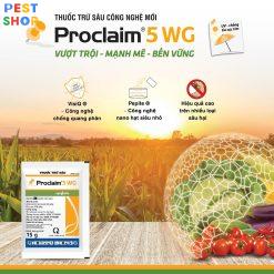 Proclaim 5WG được sử dụng để phòng, điều trị các loại sâu bệnh trên cây trồng. Thuốc tác động lên hệ thần kinh làm côn trùng tê liệt và chết nhanh chóng. Sử dụng để bảo vệ các loài câu như: sâu cuốn lá, sâu đục quả, sâu keo mùa thu, sâu xanh da láng,…