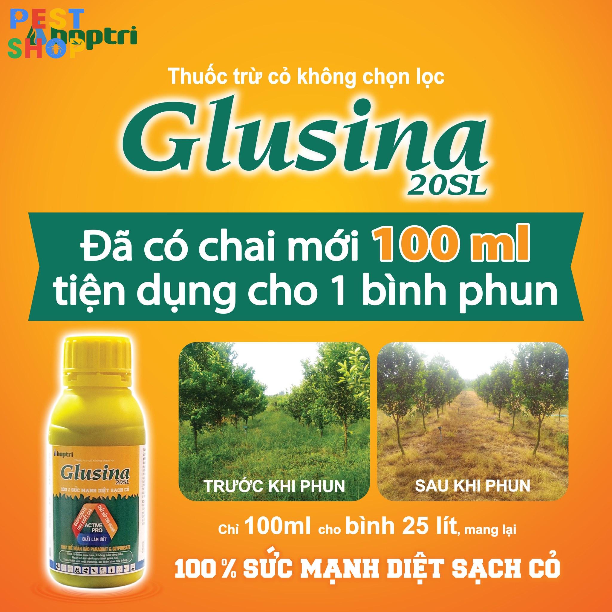 Glusina 20SL là thuốc diệt cỏ không chọn lọc với công nghệ độc quyền từ Active Pro, thành phần hoạt chất tinh khiết cao kết hợp chất làm ướt giúp mang lại hiệu quả diệt trừ cỏ cao.